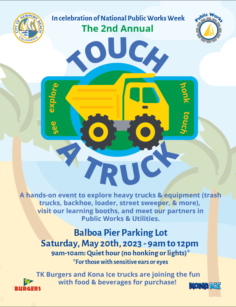 Please join us for a “Touch a Truck” event on Saturday, May 20 from 9 a.m. to noon at the Balboa Pier parking lot in celebration of National Public Works Week.