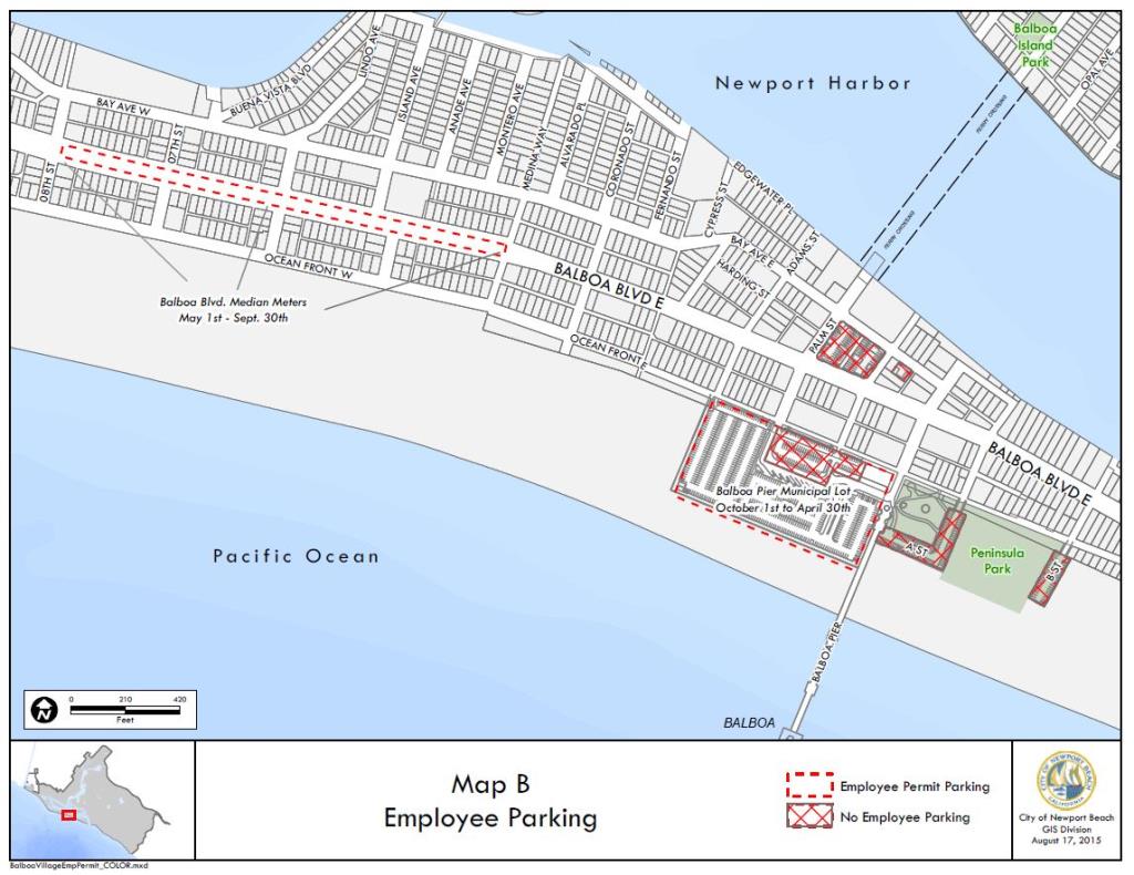 - During the peak season, May 1st through September 30th, the designated parking area is the Balboa Blvd median between Medina Way and 8th St., (see attached map B). During posted street sweeping times only, the Balboa Pier parking lot will be the designated parking area. Vehicles must be moved after upon end of posted street sweeping times. If no spaces are available at this location, a permit holder will have to park where they legally can; however, the permit will not be valid for any public lots or other metered spaces.
